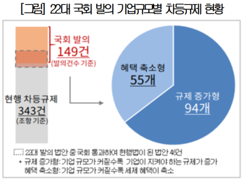 22대 국회 출범 이후 기업 규모에 따라 규제를 차등 적용하는 법안이 대거 발의되면서 기업들이 성장할수록 부담이 늘어나는 제도 환경이 확대되고 있다는 지적이 제기됐다.
