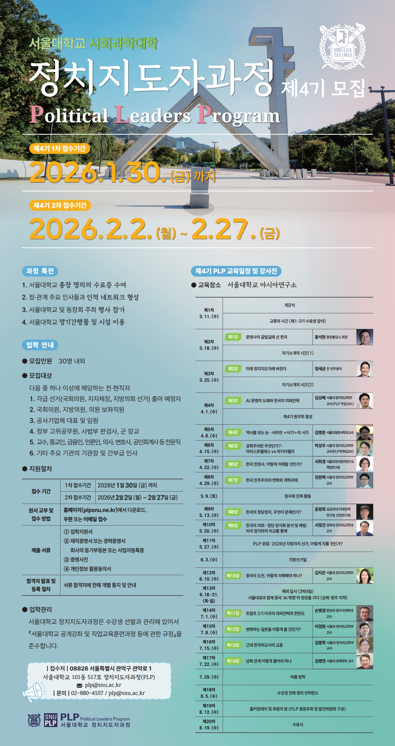 | ‒ | 서울대학교 정치지도자과정 제4기 수강생 모집 |