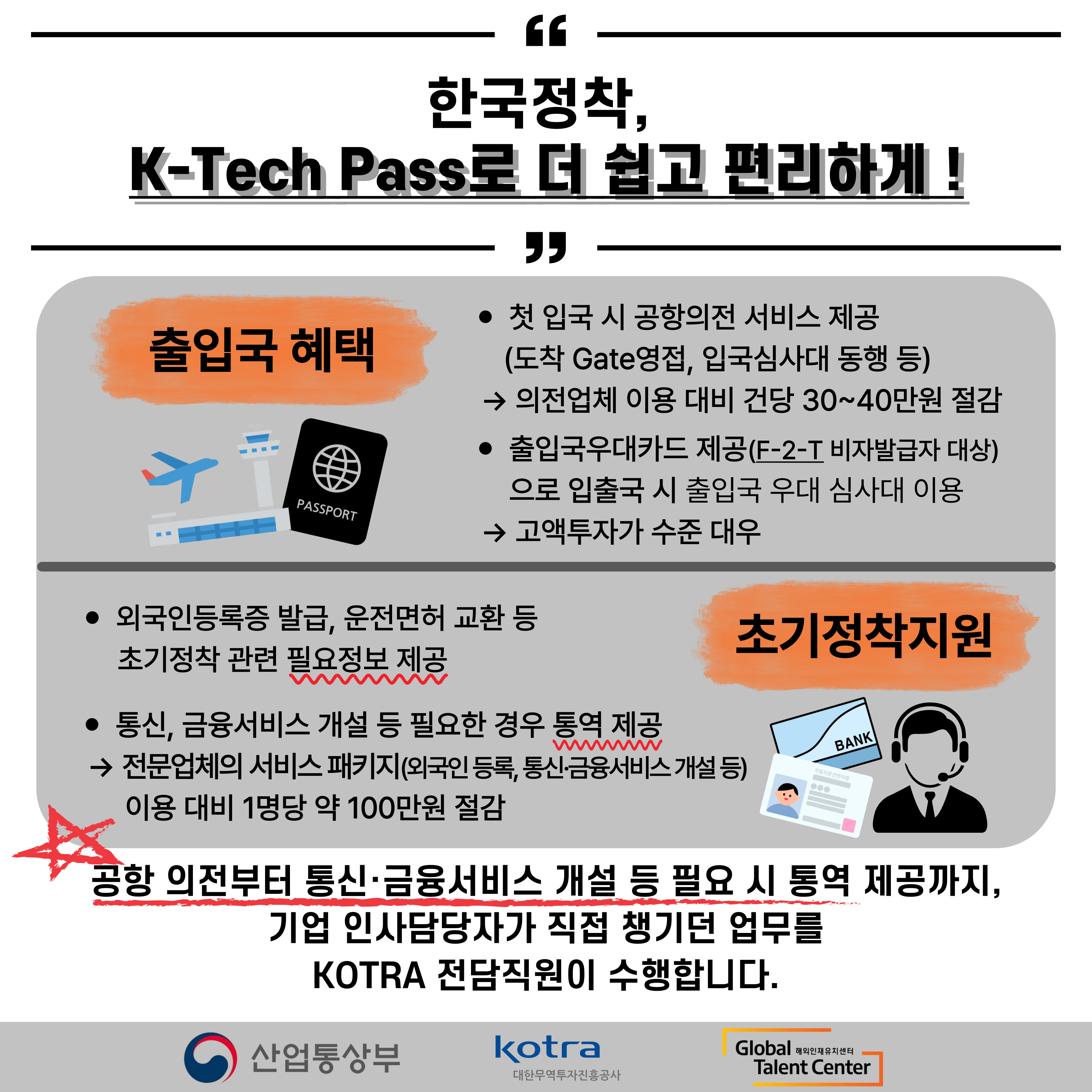 | 제목 | K-Tech Pass, 해외인재 출입국 혜택 및 초기정착지원 안내 | ||