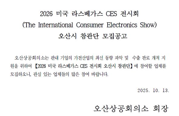 | ‒ | 2026 미국 라스베가스 CES 전시회 오산시 참관단 모집공고 |